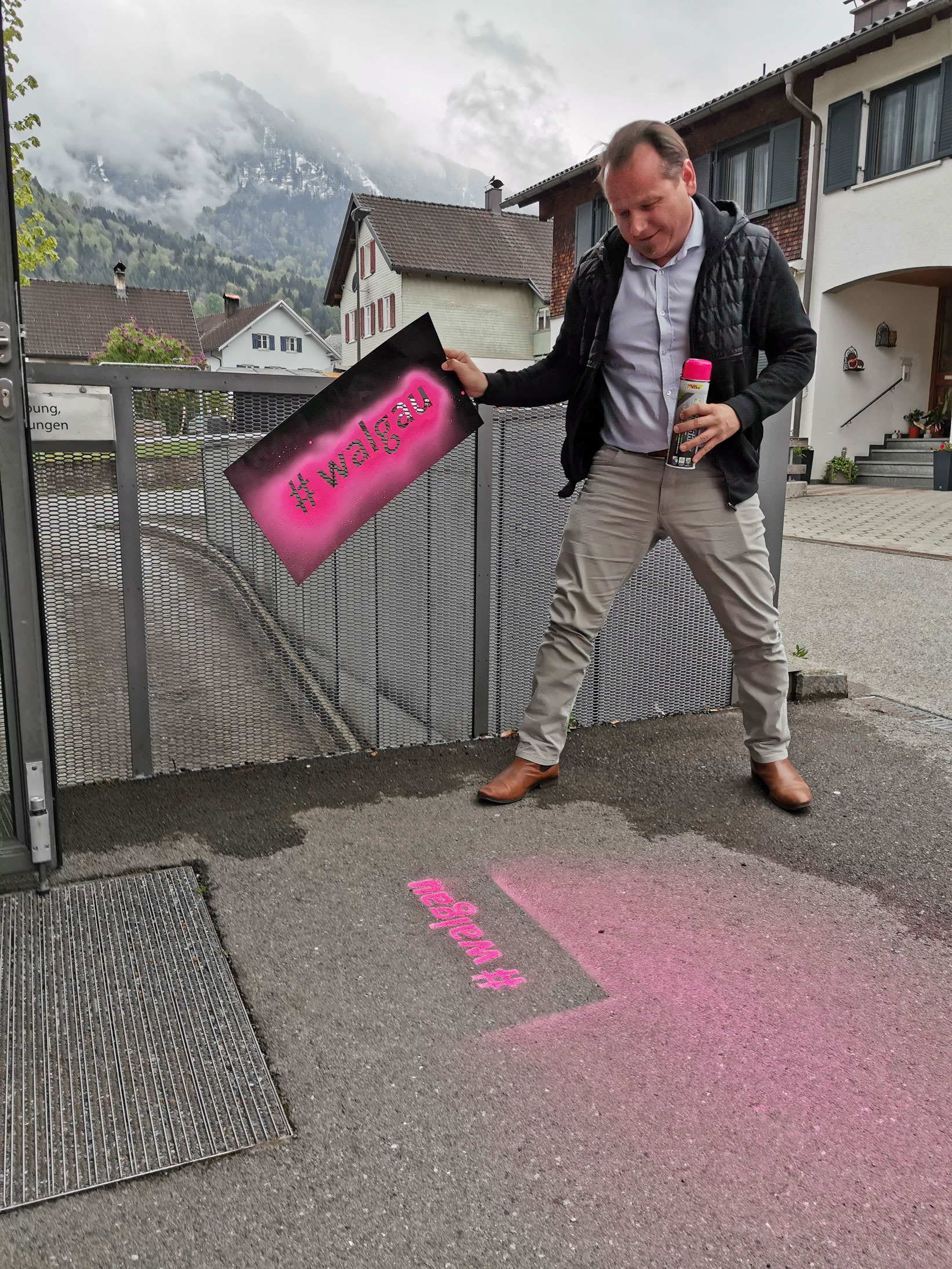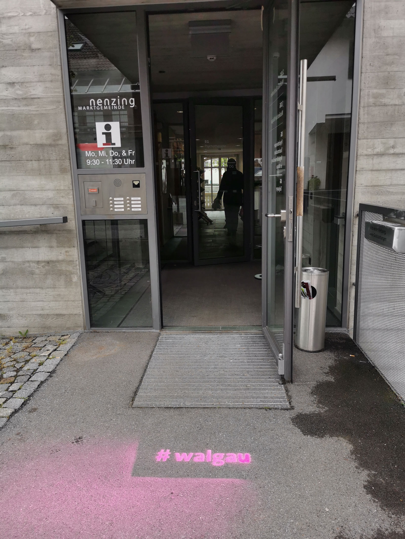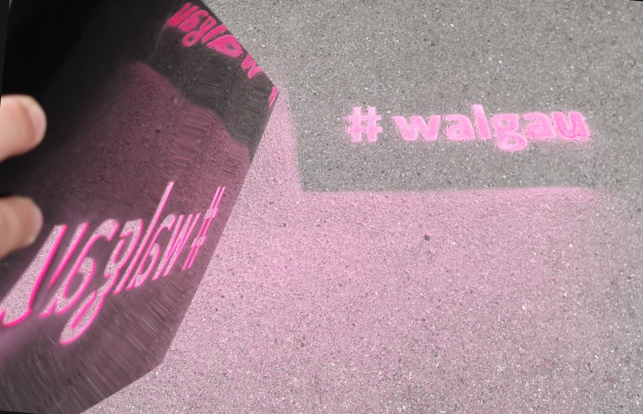 Um die Bürger*innen auf die Hashtags aufmerksam zu machen, wurden im öffentlichen Raum (auf Gehsteigen, vor dem Rathaus, bei Bushaltestellen etc.) mittels farbigen Spray die jeweiligen Hashtags angebracht. Dabei kam ein Spray auf Kreidebasis zum Einsatz. Die Zeichen sind in einigen Wochen wieder abgewaschen.